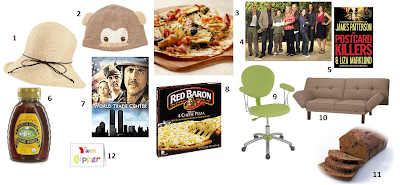 1. Forever 21 hat 2. baby organic hat 3. pizza recipe 4. new tv show No Ordinary Family 5. NY Times #1 bestseller 6. organic honey 7. World Trade Center movie 8. Red Baron cheese pizza 9, 10. Target college decor 11. Rosh Hashanah recipes 12. Yom Kippur greeting card