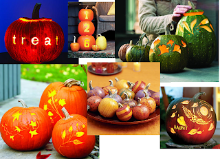 I love these black pumpkins from Martha Steward! You can find the directions here. You will need pumpkins, carving tools, masking tape, black floral spray, battery powered light, needle tool or awl, waxed paper and a needle.