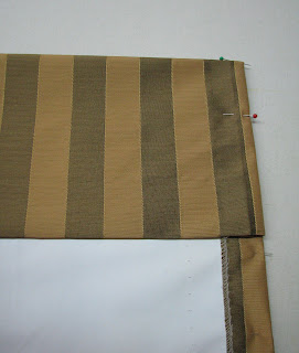 1. Cut fabric the finished width (remember to include the returns on the mounting board!) + 4″ for side hems x 32 1/2″ long. Cut lining the finished width x 28 1/2″.