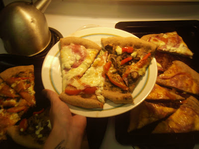 left pizza: Pesto, mozzarella cheese, tomato, goat cheese, red pepper, red onion + mushrooms