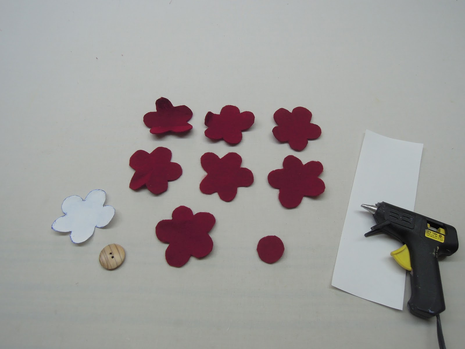 First draw a simple flower on paper like the one shown. It does not have to be perfect. Mine is about 3″ x 3″ big. Cut out your pattern and trace it on to the fabric 7 times for one flower. You will also need 1 round piece for the back of the flower. Cut out your pieces, making sure no ink shows.