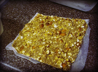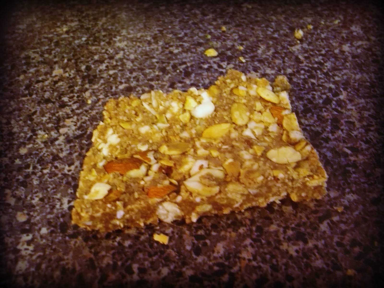 Mix all of the ingredients together. Lay down parchment in a square pan and spray with the coconut oil (or other oil). Press down on the mixture until it is fairly flat and covered the bottom. Stick it in the freezer for one hour. Now cut your pieces out! If your mixture was too try, they will be quite crumbly (works as granola or trail mix) otherwise they should hold their shape well.