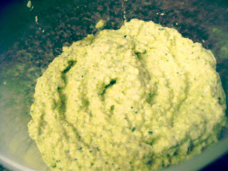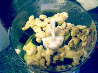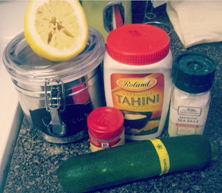 juice from 1/2 lemon, 1 zucchini, 1/4 cup cashews, pinchof papryka, 1tsp salt, 2 cloves of garlic and 1/4 cup tahini (sesame paste).