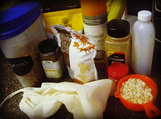 1 cup sunflower seeds, 1/4 cup coconut, 1/2 cup pumpkin seeds, 1/2 cup almonds, coconut oil spray or other oil, pinch of all spice, 1tsp cinnamon, 1/4 tsp ginger, 2 tsp vanilla extract, sweetener to taste.