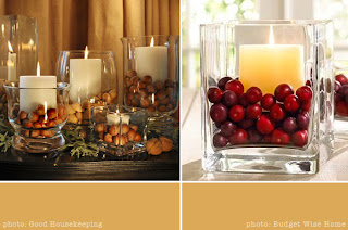 The Fun Times Guide has this picture of a very simple but rich looking center piece. All you need are various gourds and pumpkins in a large vase, the kind you see used for floating candles.