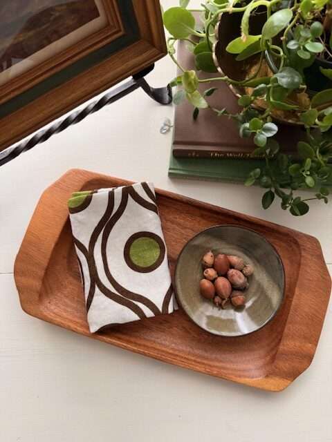Gorgeous block print linen tea towels. A striking mid-century design of bold green and brown on an ivory background – this fabric is very high quality and a nice, heavier weight. These kitchen towels are hand-crafted in my studio.